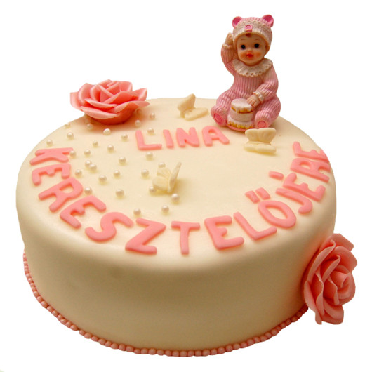 Marcipán bevonat - színkód: ecrü; marcipán betűk, színkód: R3; cukorgyöngy; kerámia figura (1 db); marcipán rózsa-extra 13 (2 db); marcipán pillangó (3 db).